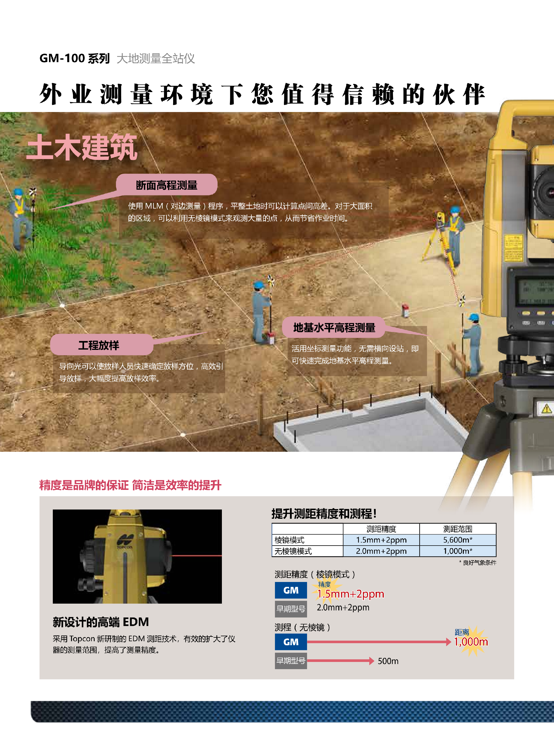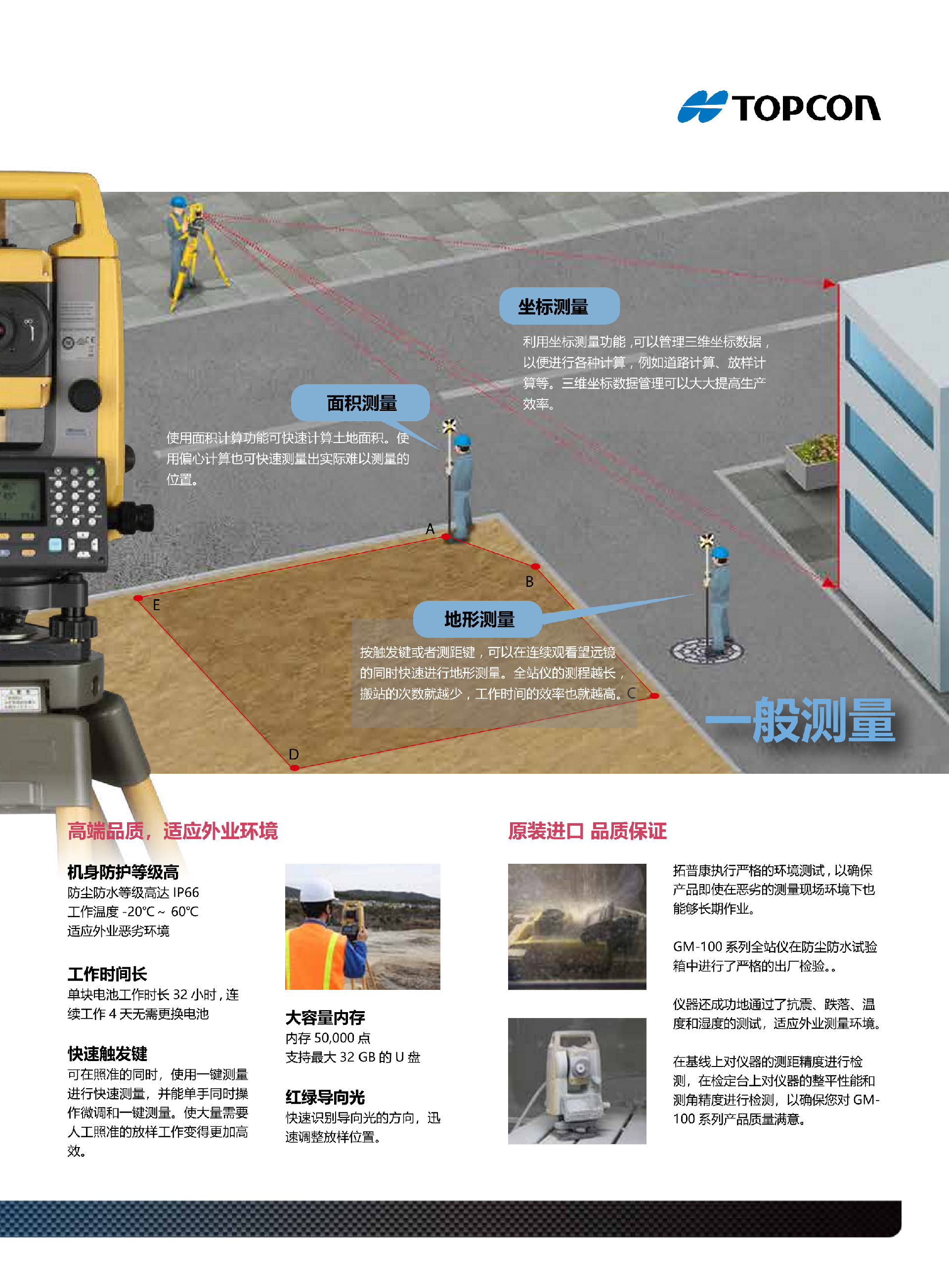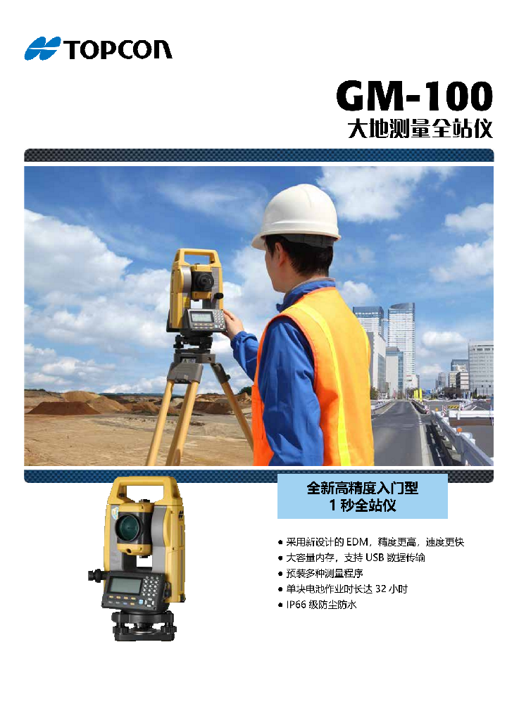 GM100全站仪机身坚固,采用精密测角、测距技术,适合隧道、桥梁、钢结构、水利等大型测量项目??羰〉缒J?,一块电池可用32小时。