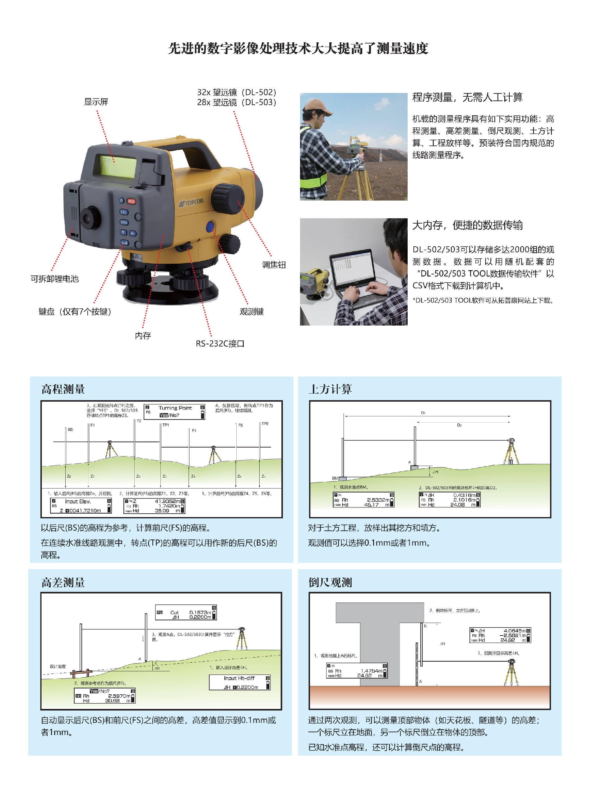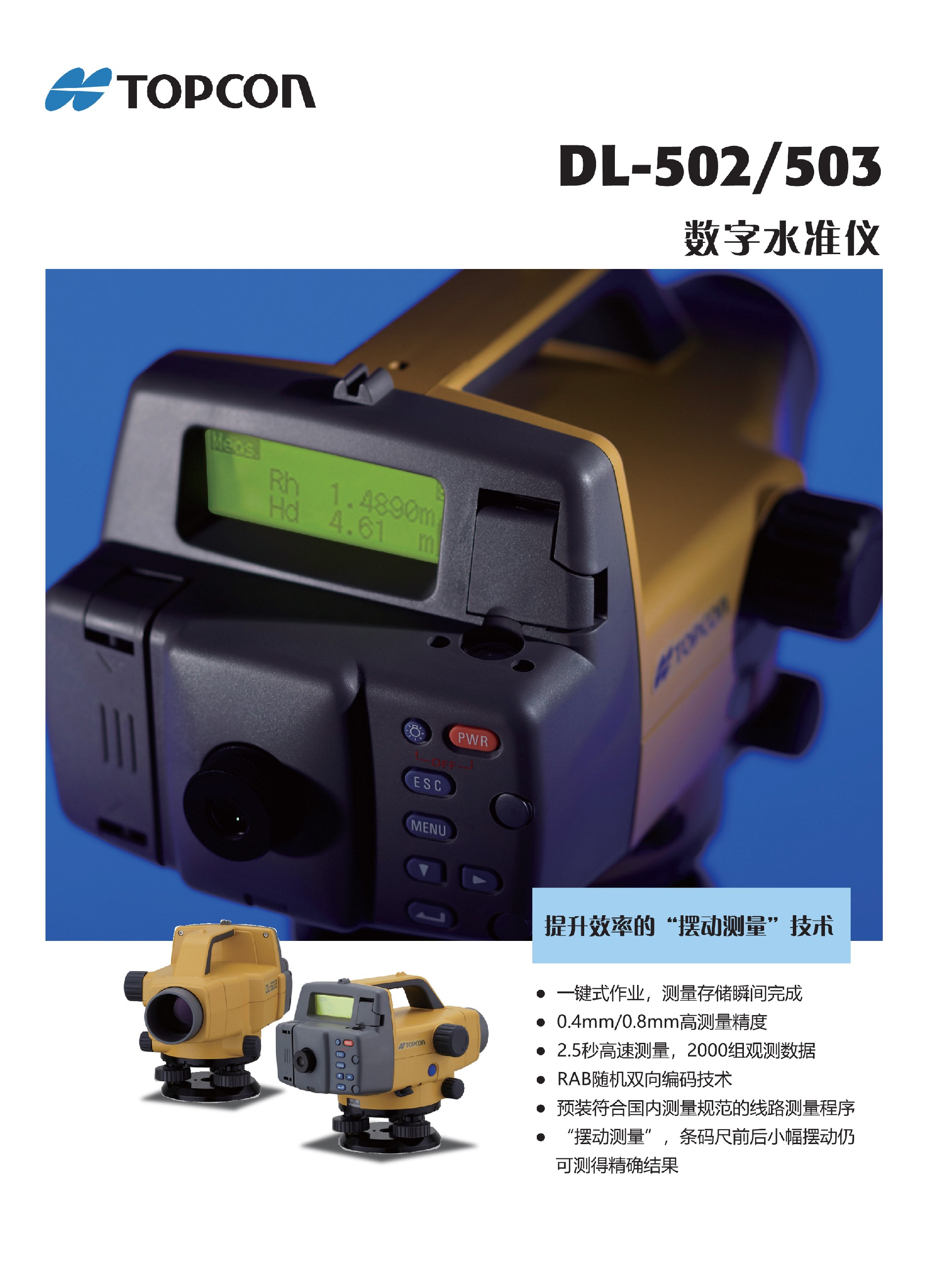 DL502/503数字水准仪可自动识别RAB条码,观测结果比人工读尺更可靠;它操作简单,功能强大,2.5秒即可完成水准测量、记录和计算。让您在外业测量中,事半功倍。