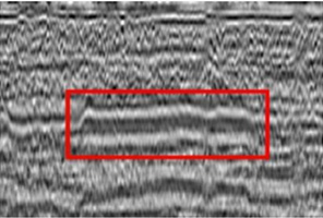 裂缝:裂缝的雷达波形主要表现为同相轴断开,并且两侧有反射波。从同相轴断开的缺口宽度,可以估计裂缝的宽度范围,裂缝的深度可以从雷达波缺口的上下位置看出。