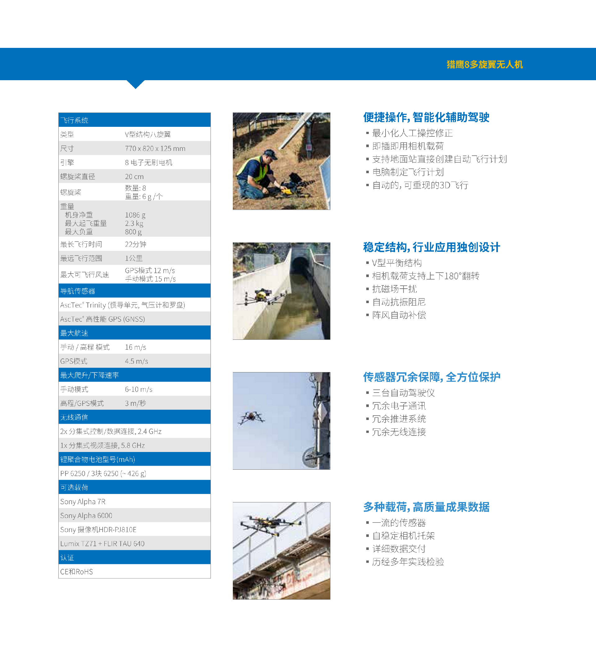 ●稳:内置多达 31 种传感器,三倍冗余备份,可抗七级风速。●准:可翻折高倍变焦相机全方位工作,实时远距离修改相机拍摄参数?!窨欤?6 米 / 秒飞行速度,10 米 / 秒爬升速度●精:配合结构物检测软件自动分析提取0.1mm裂缝